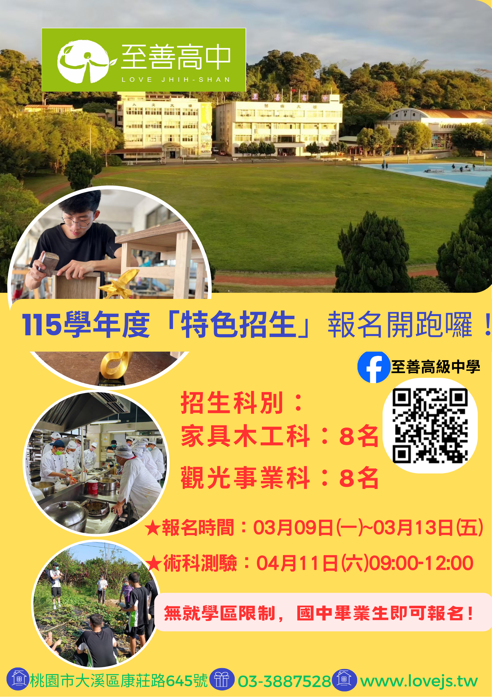 八、報名方式:國中生學生/家長可填寫報名表單,並回傳至至善學校財團法人桃園市至善高級中等學校教務處。(傳真:03-3877382或信箱至: cheng031323@gmail.com)